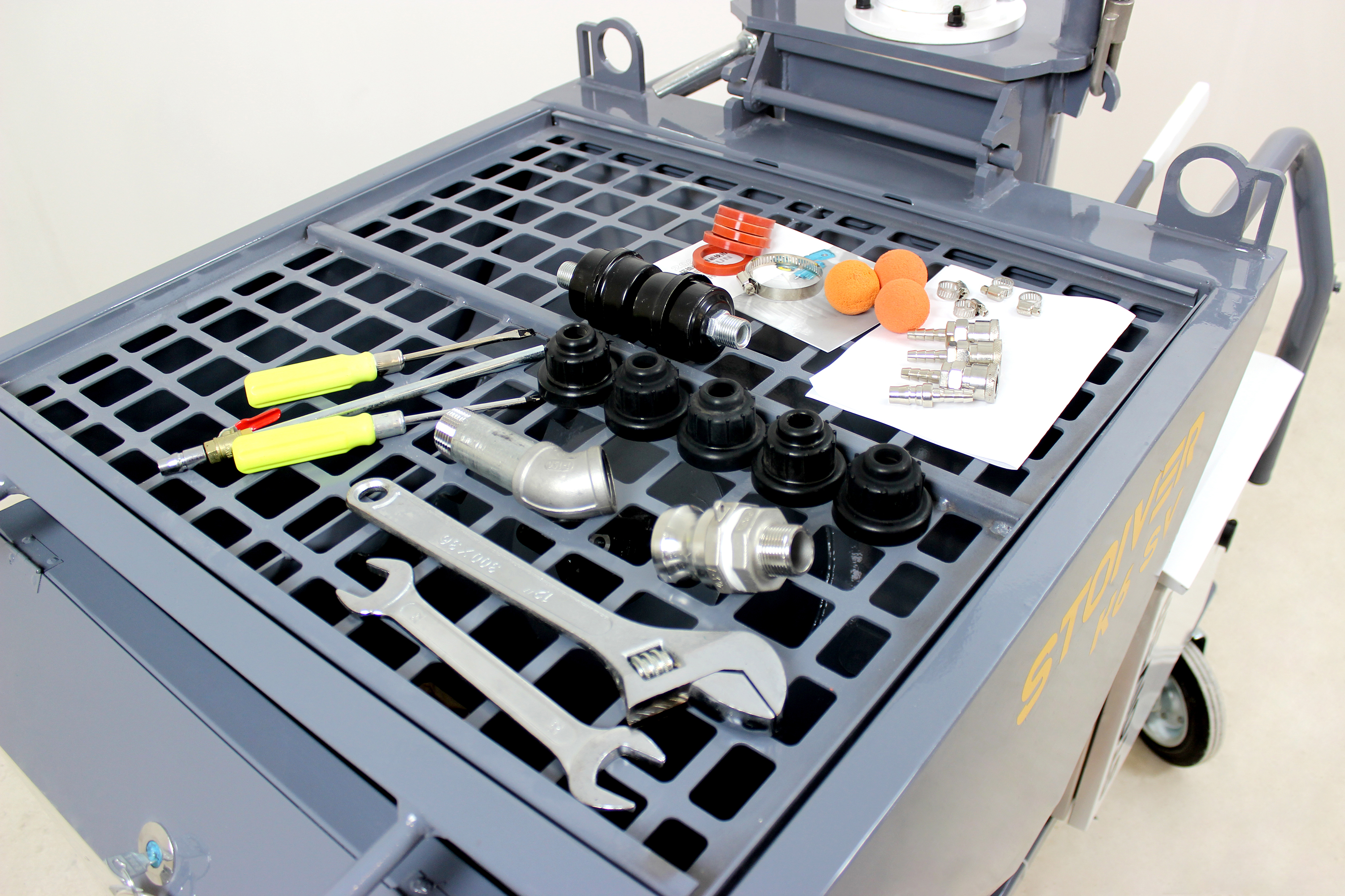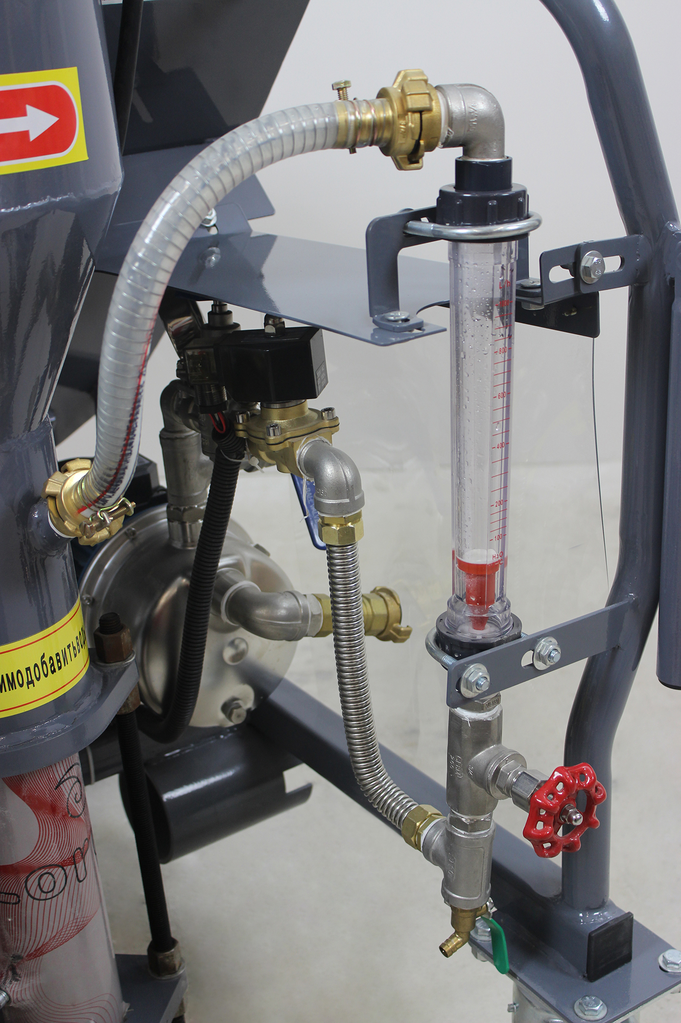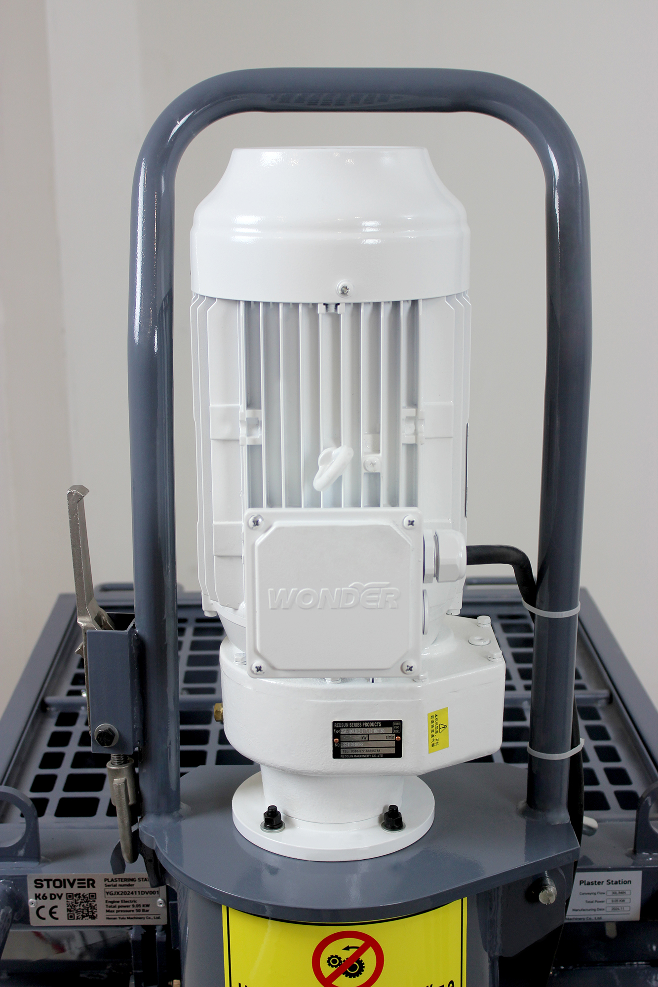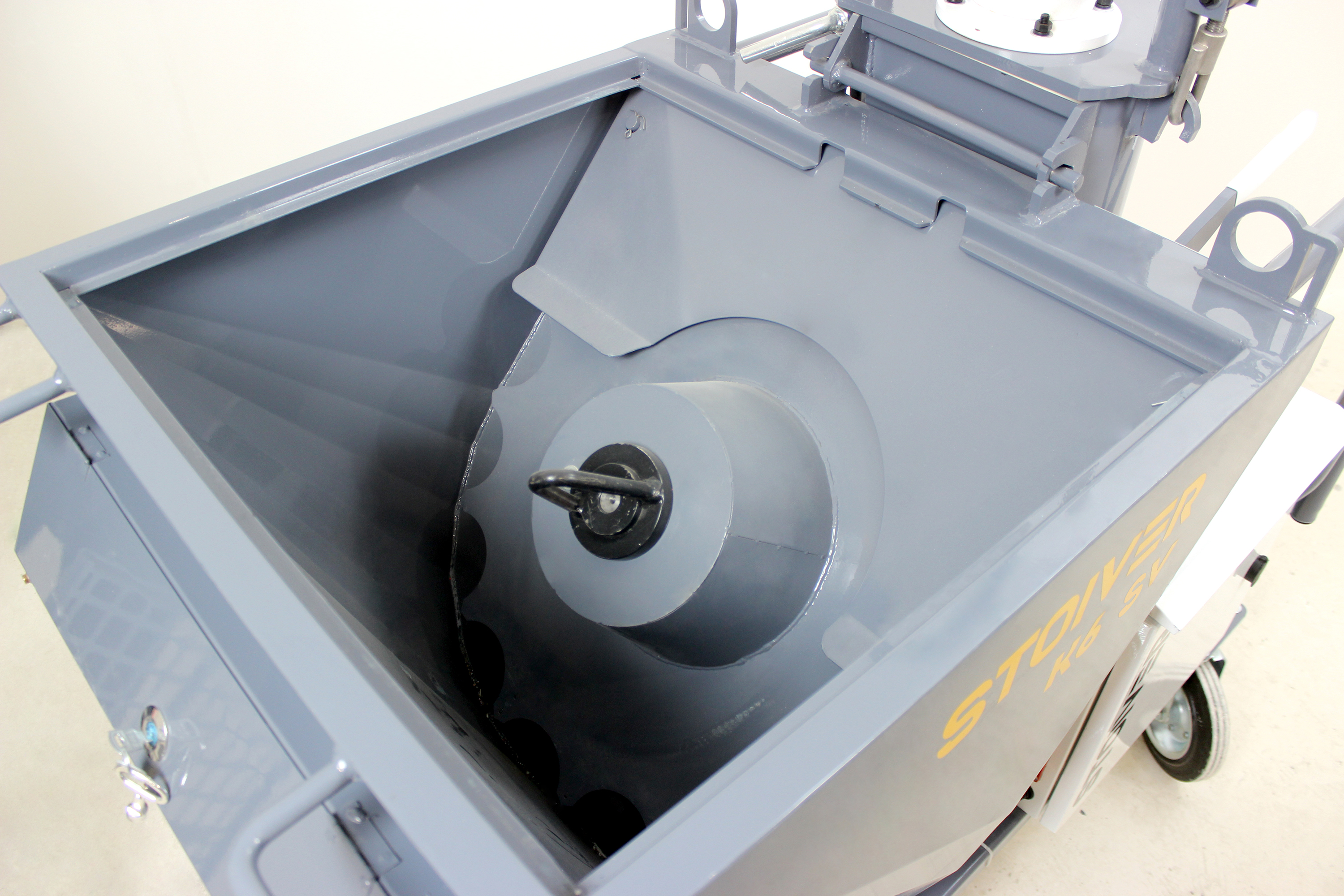 Штукатурная станция STOIVER K6 SV 380 Вт оборудована большим бункером на 150 кг, высота загрузки которого составляет 930 мм. Водяной насос поддерживает постоянное рабочее давление воды внутри станции. Шланг подачи воды в смесительную колонну выполнен из качественного армированного материала, полностью исключающий его изломы при использовании.